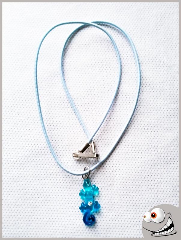 collier salamandre pour enfant dégradé de bleu cordon élastique bleu ciel environ 2.5cm sur 1cm (polymère) un strass blanc au centre